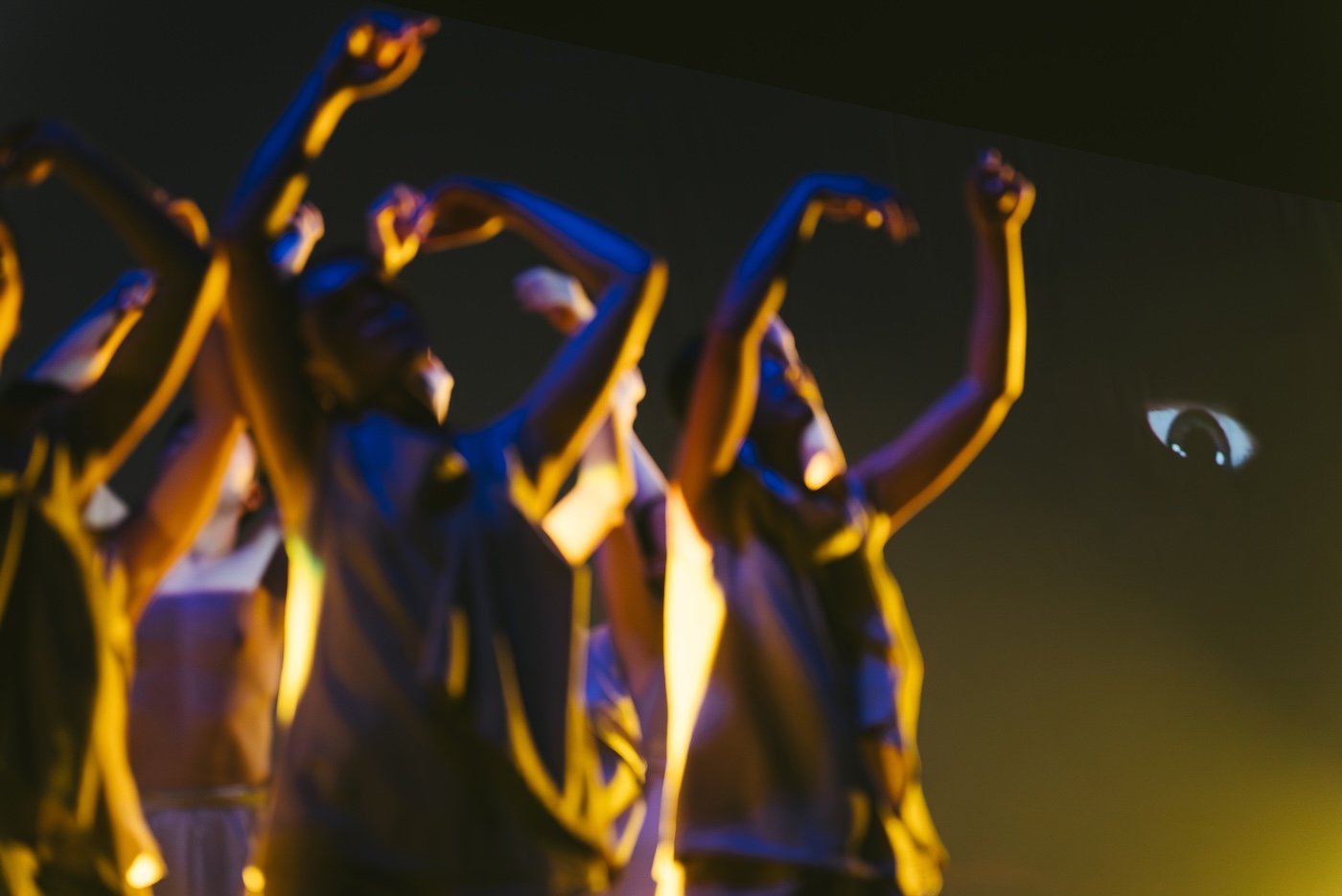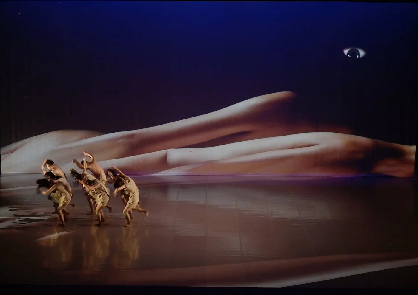 Against the “eyes above” that figure a divine gaze, the “eyes below” denote spectators and tourists. When looking becomes occupation, the dancers are submerged and nearly erased—revealing how modern visual culture consumes traditional bodies.