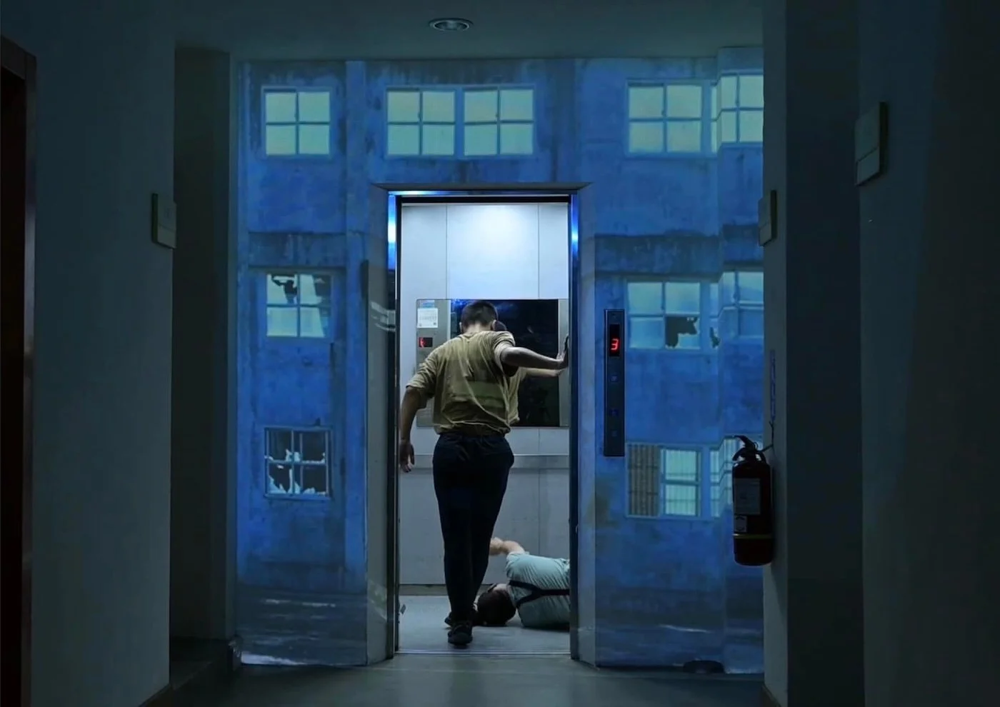 The elevator’s opening and closing function as live “cuts”: projection alternates between protagonist and backdrop for the performer.