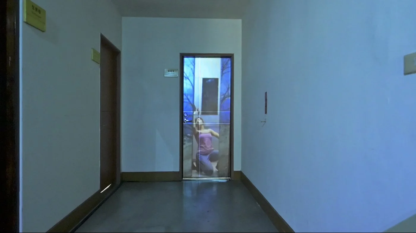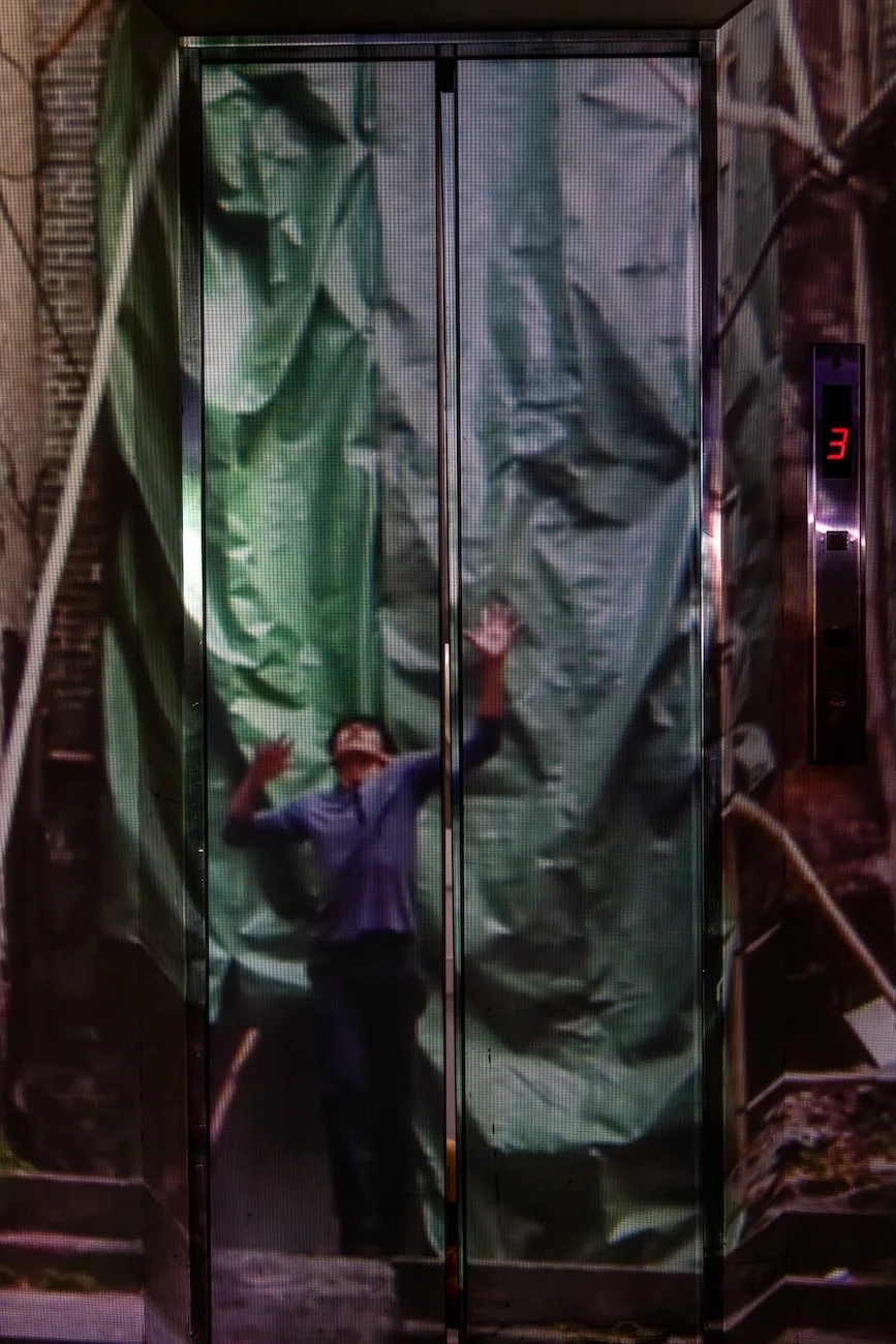 Live footage from inside the elevator is streamed and re-projected onto a corridor door inside the same building, creating an illusion of site displacement.