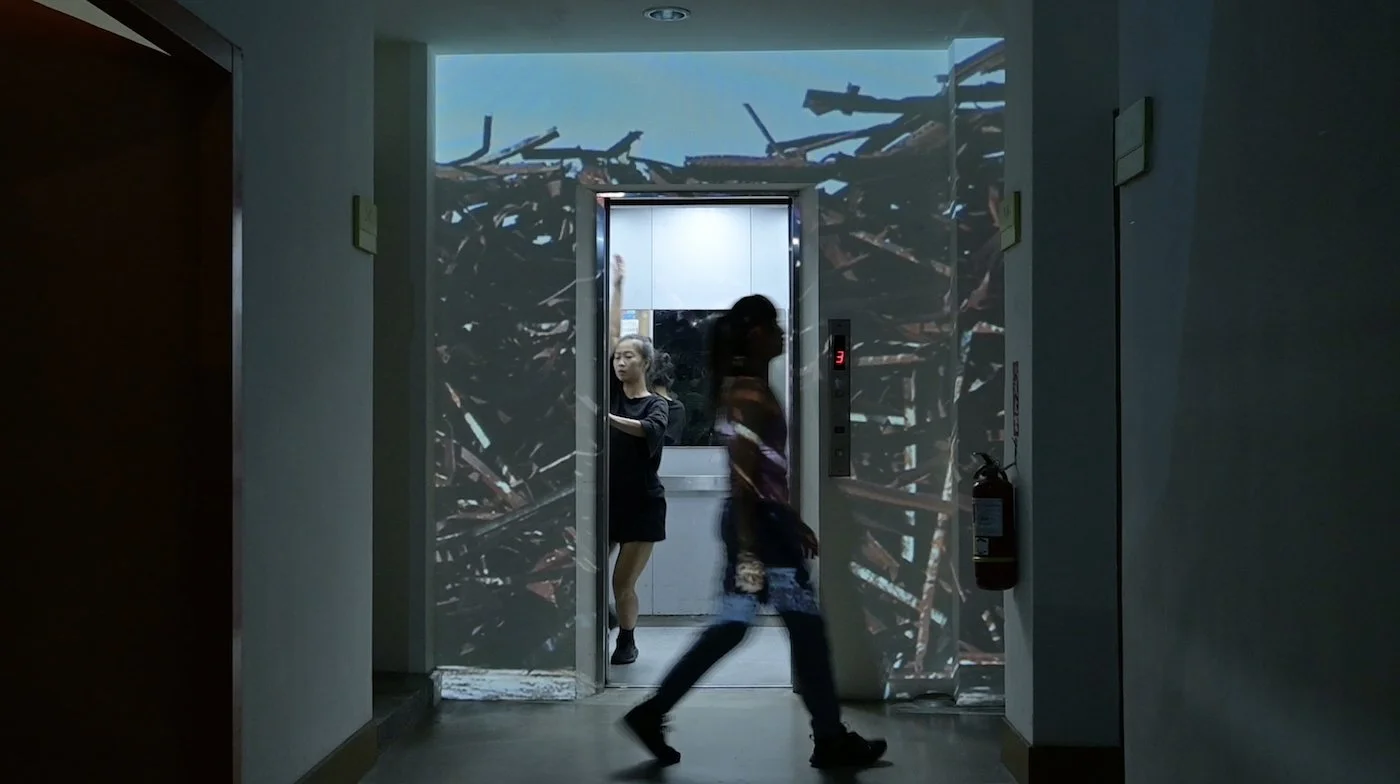 2. From Past to Present — Dance footage gathered across years and travels is projected onto the elevator doors as they open and close; shifting locations and bodies trace the flow of time.